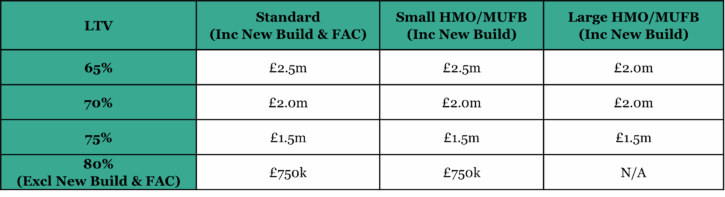 | Loan to value (LTV) | Up to 80% LTV. New builds, flats above commercial and Large HMO & MUFBs (7-12 bedrooms/units) are up to 75% LTV. |